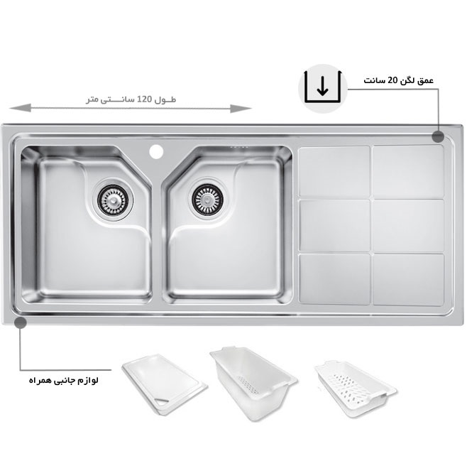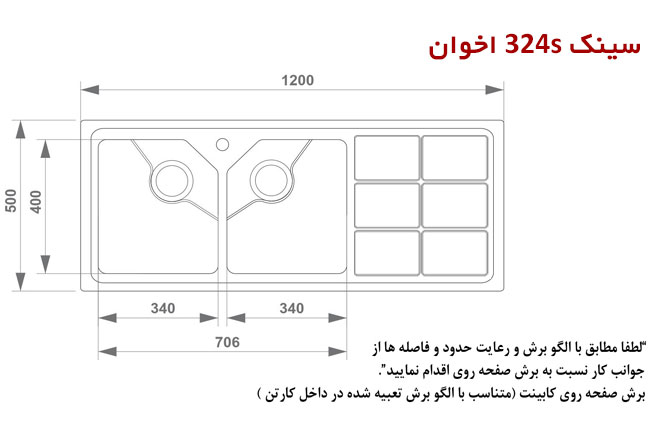 نام محصول : سينک ظرفشویی اخوان 324 اس | Akhavan sink 324s inset نصب به صورت : توکار نوع ورق استیل : استیل ضد زنگ Aisi – 304 تعداد و نوع لگن : دو لگن – بزرگ ضخامت ورق استفاده شده : استیل با ضخامت بالا | یک میلیمتری ابعاد خارجی محل نصب : 120 در 50 سانتی متر عمق لگن : دارای لگن عمیق 20 سانتی متر سمت لگن ها : قابلیت انتخاب لگن چپ و راست در هنگام سفارش لوازم سیفون: دارد به همراه زیراب فانتزی بزرگ بدون جامایع متصل بر روی سینک لوازم جانبی همراه : سبد ، تخته گوشت و سبد میوه شور می باشد. امکان اضافه شدن تخلیه لباسشویی : دارد سوراخ نصب شیر : دارد – امکان نصب شیرالات با وزن بالا نوع اتصال سینک به کابینت : بست فلزی نوع زیراب استفاده شده : دایره ای با تخلیه سریع نوع طراحی لگن : طراحی لگن ها R25 ( محبوب ترین طرح لگن